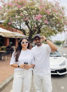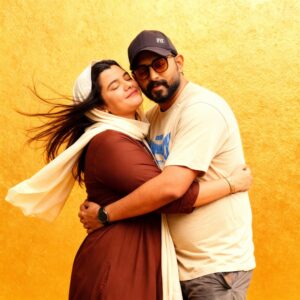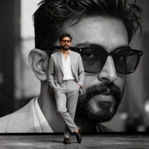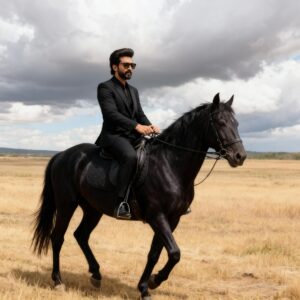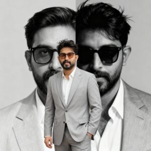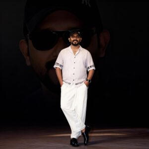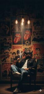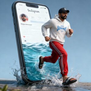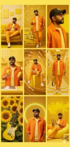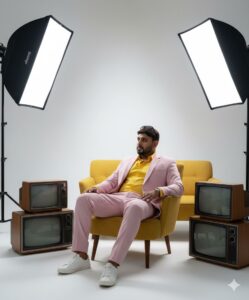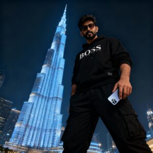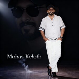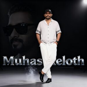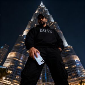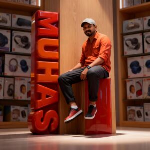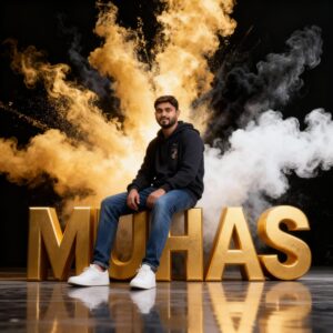 Create ultra-realistic digital art of a person (use reference photo) in a dynamic full-body pose. The subject wears casual relaxed outfits in bold colors (shirt, pants, shoes), appearing stylish and modern. Add a single text “MUHAS” displayed vertically, rendered as large 3D block glossy letters in a bold contrasting color. The text should appear only once, without repetition, and be big enough to look like a real object. Make the model interact with the text, for example sitting on.